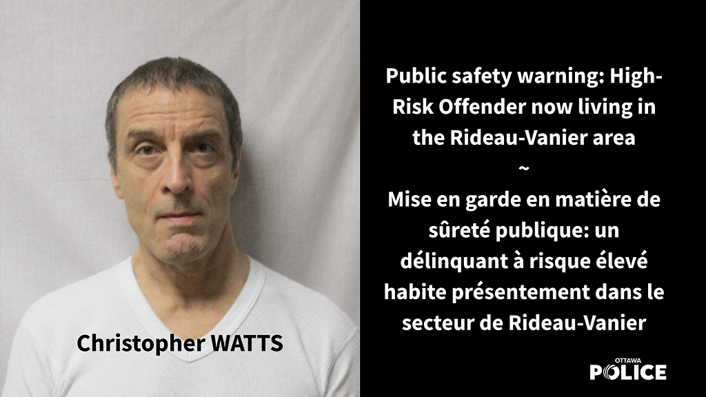 The Ottawa Police Service (OPS) would like to inform the public that 64-year-old Christopher WATTS, who has been deemed a high-risk offender since 2015, is now living in the Rideau-Vanier area.