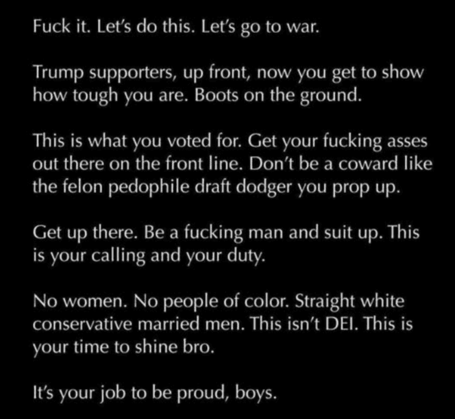 Unfortunately, too many people think war is something other people fight. Other people lose children, limbs, homes, futures. Those costs are conveniently absent from most online bravado.