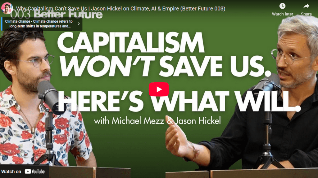 I watched an interview between Michael Mezzatesta and Jason Hickel and it stuck with me because it refuses to soften the question at the centre of our ecological crisis. Hickel does not argue that capitalism needs better guardrails or greener tweaks. He argues that a system built on endless growth cannot coexist with a finite planet.